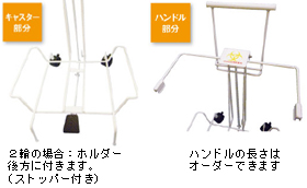 キャスター(2輪または4輪)をつけることができます。キャスター装着するとハンドルも当然、必要となりますのでキャスター+ハンドルの装備をオプションで付ける事ができます。(有料となります)